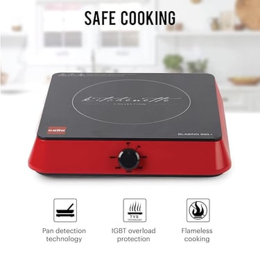 Cello Induction Cooker Blazing 600+ | 1800 Watt Induction Cooktop | 2-in-1 knob design with Grade Crystal Shiny Glass Plate | Compact and Portable | Multi-Purpose Use | Red