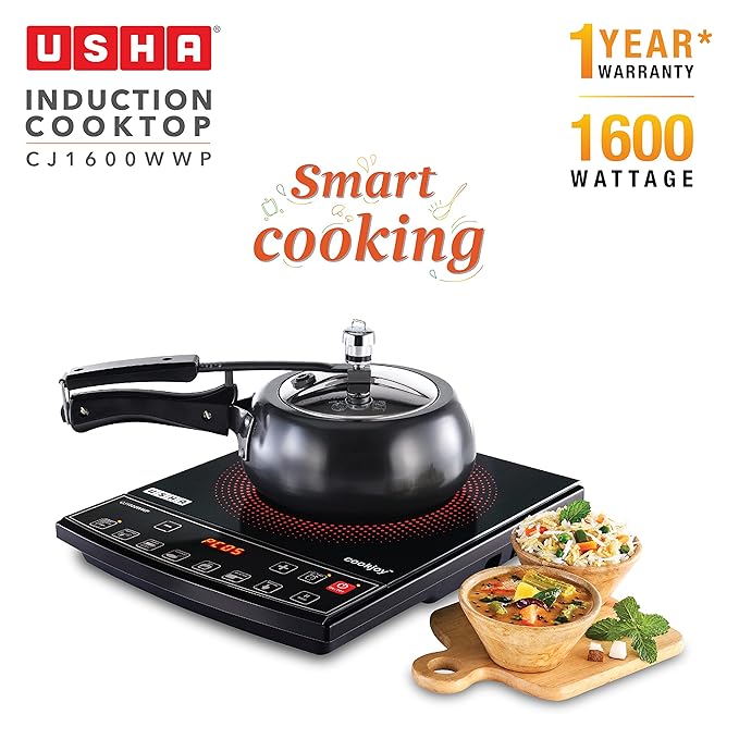 USHA Cookjoy Radiant Induction Cooktop 1600 Watts Cj1600Wwp with Keep Warm Option and 6 Indian Pre-Set Menu (Black)